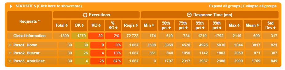 En primera instancia muestra un resultado bien fácil de entender de cómo resultó la prueba, en cuanto a respuestas fallidas, y en cuanto a distribución de los tiempos de respuesta: